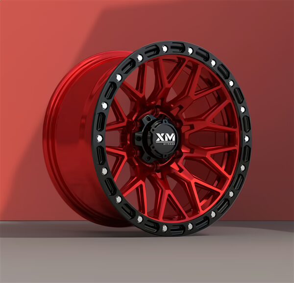 XM-704 17×9 Flow Form Candy Red wheel with 5×127 bolt pattern for Jeep Wrangler & Gladiator. Lightweight strength with bold, head-turning style.
